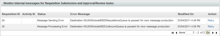 メッセージ モニタが使用されるのは、[Submit, Approve and Review Tasks Asynchronously] 設定がオンの場合のみです。万一 Service Portal での要求送信やタスク承認要求の非同期処理においてエラーが発生したときは、失敗を示すメッセージが内部的メッセージ モニタ セクションに表示されます。