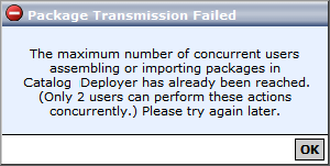 この設定を使用すると、Catalog Deployer の同時ユーザ数をゼロにリセットできます。Catalog Deployer の同時ユーザの最大許容数は 2 です。Catalog Deployer の同時ユーザ数が 2 を超える場合は、この状況を表す次のようなメッセージが表示されます。