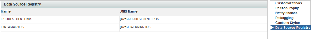 [Data Source registry] には、使用可能なすべてのデータ ソースが一覧表示されます。データソースを作成するには、『 Cisco Service Portal Installation Guide 』を参照してください。
