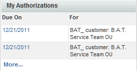 Authorizations ポートレットでは、承認のうち最新の 5 件が表示され、現在のユーザに割り当てられているすべての承認を表示することもできます。承認にアクセスする方法としては他にも、[Common Tasks] > [Authorizations] リンクや、My Services モジュールのナビゲーション バーの [Authorizations] タブがあります。