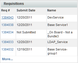 Requisitions ポートレットには、送信済みで進行中の要求のうち最新の 5 件が表示され、ここから要求にアクセスできます。イネーブルのときは、このポートレットは [My Services] 画面の左側に表示されます。