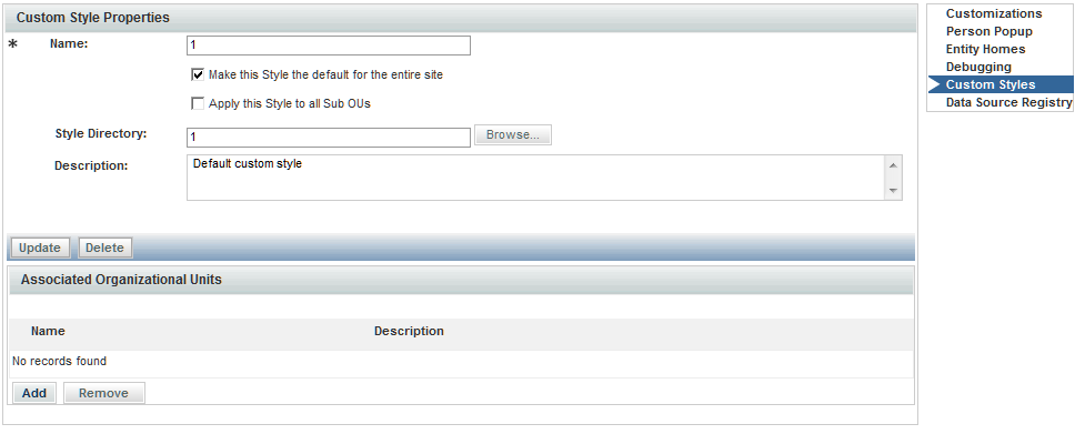 カスタム スタイル シートやヘッダーとフッターをオンにすることは、Web ページの外観カスタマイズの最初のステップに過ぎません。管理者は、使用するスタイルを設計して、該当するファイルを適切なサーバにアップロードする必要があります。また、Administration の [Custom Styles] オプションを使用してスタイルをサイトに、またはサイト内の特定の組織に関連付ける必要があります。
