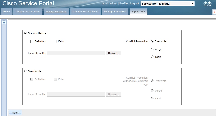 Service Item Manager のインポート機能を使用して、外部定義のサービス項目と標準を Request Center にインポートするか、Service Link のファイル アダプタを使用して、サービス項目または標準のデータをインポートすることもできます。