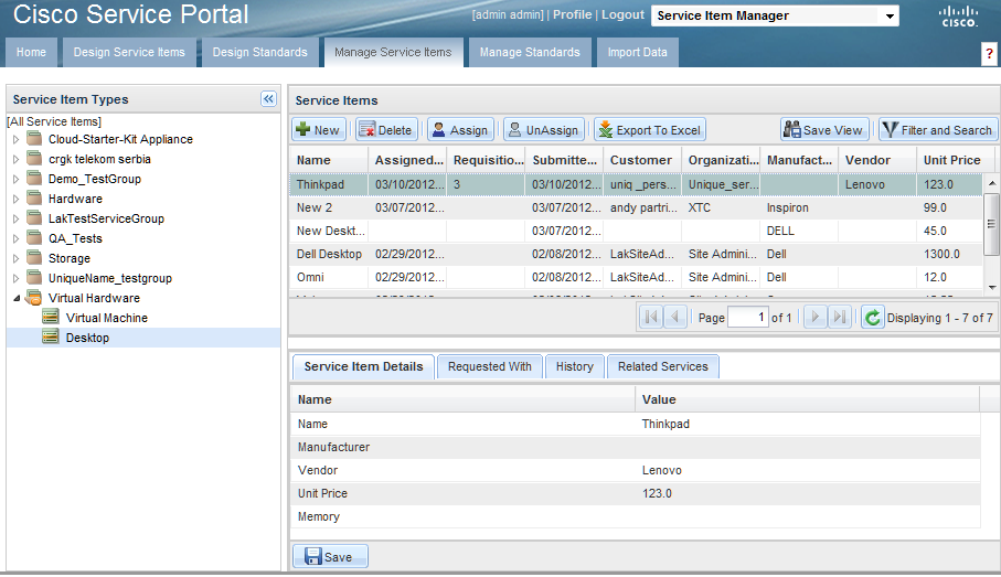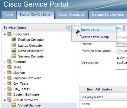 サービス項目タイプ:サービス項目グループの子であり、これも [Design Service Items] タブで管理されます。[Virtual Hardware] サービス項目グループには、事前に設定されているサービス項目である Virtual Machine が含まれています。これで仮想データセンター(VDC)サービスをサポートします。このサービス項目は変更できません。このグループ内、または他のサービス項目グループ内にサービス項目をさらに作成したり、管理したりできます。
