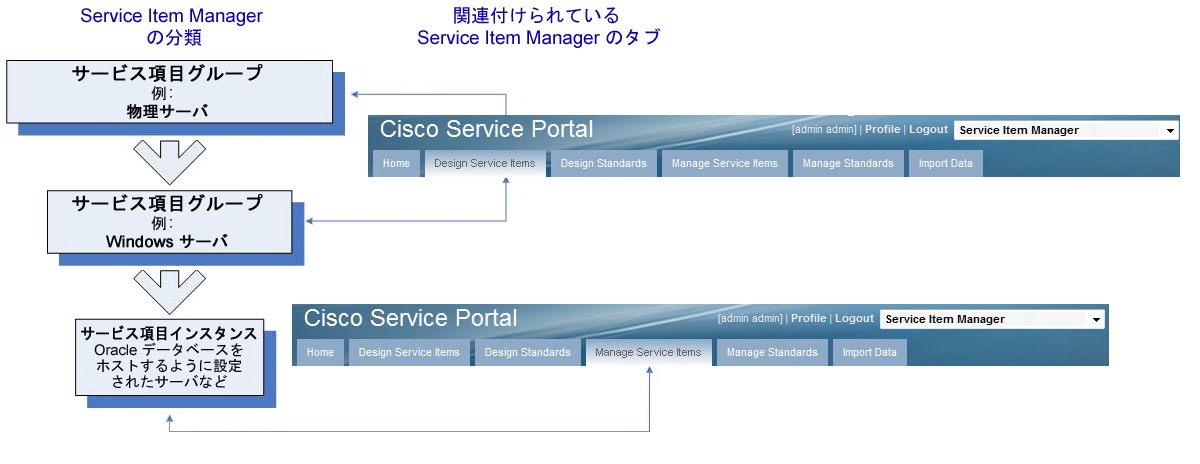 Service Item Manager は、サービス項目を定義したり、仮想マシンなどの事前に設定されているサービス項目定義を確認したりするために使用します。