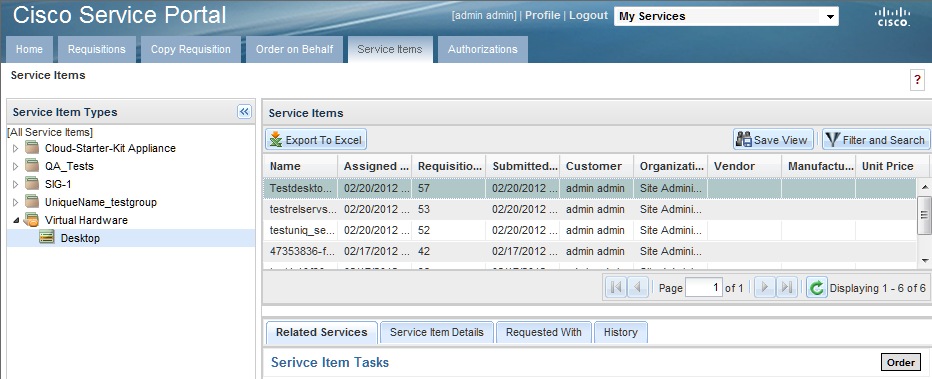 これで、管理者は、さまざまなカスタマーに対応したサービスをオーダーできるようになりました。また、カスタマーは、[Service Items] ページや [My Items] ポートレットからサービス項目を確認することができます(カスタマーに My Services 360-Degree Consumer ロールまたは Professional ロールが付与されている場合)。サービス項目に、SI の所有者にオーダー権限がある関連サービスが含まれていると、[Service Items] ページから直接これらのサービスをオーダーできるようになります。