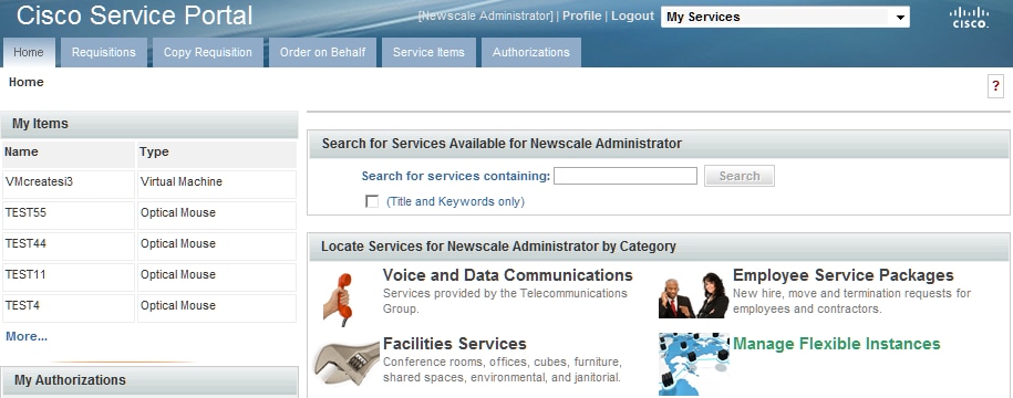 サービス項目を表示する機能が有効になると、適切なロールを持つユーザは、[My Items] ポートレットと [Service Items] タブを表示できるようになります。