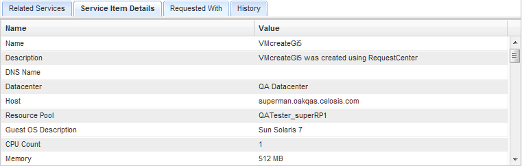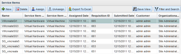 ユーザ(またはユーザの代わりに使用する管理者)が、仮想マシンを作成するサービスをオーダーし、そのサービス要求が履行されると、ユーザの名前とプロビジョニング日付が自動的に記録され、[Manage Service Item Instances] ページに表示されます。