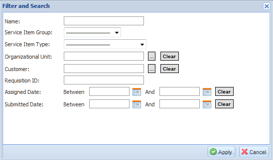 [Filter and Search] オプションを使用すると、表示されるサービス項目を制限することができます。フィルタ基準には、サービス項目を構成するすべての属性と、サービス項目の割り当て先であるカスタマーと組織単位、サービス項目がその個人に割り当てられた日付、サービス項目の作成に使用した要求 ID があります。