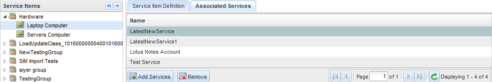 [Manage Service Items] タブの [Associated Services] サブタブを使用すると、サービス設計者がサービス項目と 1 つ以上のサービスを関連付けることができます。