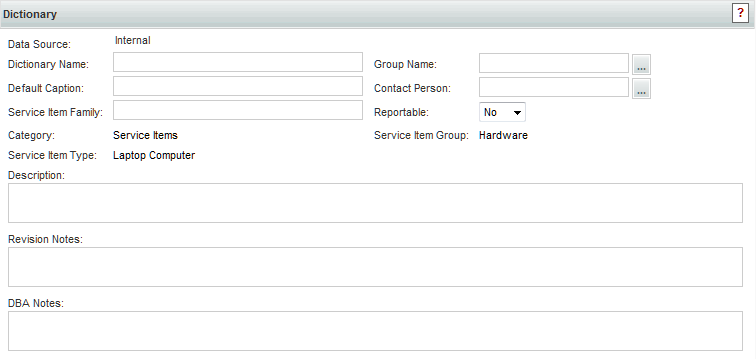 Service Designer は、サービス項目ベースのディクショナリを指定するために使用します。サービス項目ベースのディクショナリからは、サービス項目を作成したり保持したりするための、詳細要件を指定する必要のあるフィールドが提供されます。