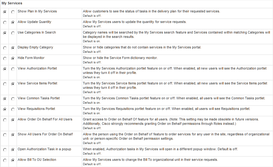 この設定をオンにすると、ユーザは [My Services] ホーム ページに [My Items] ポートレットを表示することができます。オフにすると、このポートレットはページに表示されません。