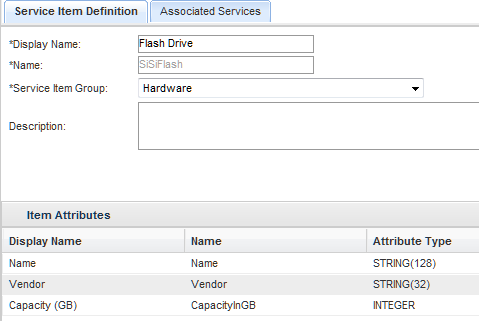 属性はサービス項目定義に自由に追加できます。修正された定義が変更されると、既存のサービス項目には、追加された属性のブランクの値が含まれます。管理者は、[Manage Service Items] オプションを使用して、新しく追加された属性に値を指定できます。
