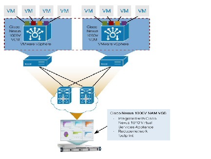 NAM-2 をデータセンターに導入し、仮想化環境用として Nexus 1000V スイッチを使用して、仮想スイッチ トラフィックをモニタする。