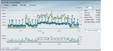 図 6-23 には、ここ 1 日のホスト トラフィックが表示されています。中央のグラフから 10:00 ~ 16:00 の時間帯に相当する部分を拡大することで、このホストで使用されているその他のアプリケーションを確認することができます。