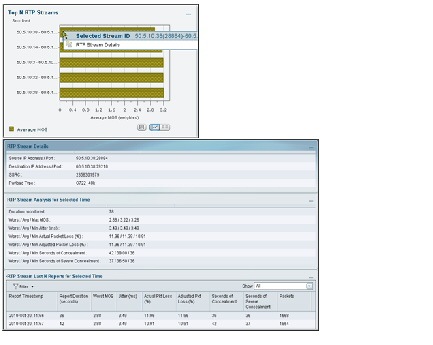 MOS が低いコールを特定するため、[Top N RTP Streams] をスクロール ダウンし、チャートをクリックして RTP ストリームの詳細をドリルダウンします。図 6-4 を見ると、リストの最上位に表示されている MOS は 2.88 という低い値であることがわかります。さらに、同じ行(たとえば 1 行め)にあるその他のメトリックを見てみると、ジッターが 3.49、パケット損失率が 11 % で、いずれも MOS 値が低くなる原因となっています。こうした情報から、コール品質が低い根本的な原因がジッターにあること、あるいはネットワーク内のいずれかの場所で発生したパケット損失にあることがわかります。