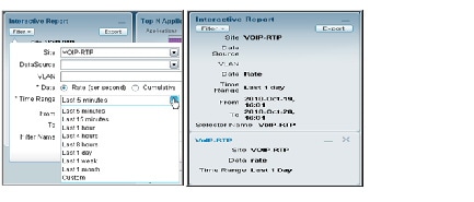 [Interactive Report] > [ Filter ] ボタン(NAM ウィンドウの左側にある)をクリックし、[Time Range] の値を変更することにより、短期の傾向を見ることも長期の傾向を見ることもできます。インタラクティブ レポートはエクスポートすることができるほか、この先必要なとき即座に参照できるようにフィルタ設定を保存することもできます。エクスポートされたデータは、電子メールを介して CSV 形式または HTML 形式で送信することができます。図 6-22を参照してください。