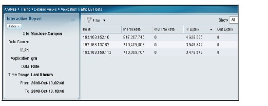 このアラームを受信した場合は、NAM GUI にアクセスして、San Jose サイトのアプリケーションを表示し、しきい値を超えるような値の上昇が発生した原因を特定します。まず [Analyze] > [Traffic] > [Application] をクリックします。左側にある [Interactive Report] ウィンドウで、[Site] の値を「San Jose」、[Application] の値を「HTTP」、[Time Range] の値を、アラートを受信したときの期間にそれぞれ変更します。これにより、このプロトコルを使用しているすべてのホストが表示されます。上位のホストを表示し、このアプリケーションにアクセスしている不正なホストがないかどうかを確認します。[Analyze] > [Traffic] > [Host] を選択すると、やり取りの多いカンバセーション(したがってこのアプリケーションに対するトラフィックが増加する原因となるカンバセーション)を表示することができます。