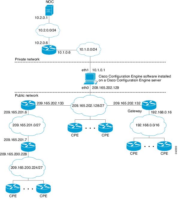(注) このパブリック ネットワークでは、ネットワーク 209.165.201.0/27、192.168.0.0/16、および 209.165.200.224/27 に至るルートはデフォルト ゲートウェイまたは Cisco Configuration Engine サーバのどちらかで定義できます。これらのルートをデフォルト ゲートウェイで定義すると、Cisco Configuration Engine サーバの管理負荷が軽減されるので、デフォルト ゲートウェイで定義することをお勧めします。ただしこの章では、Cisco Configuration Engine サーバで実行できるルーティング テーブル管理タスクを説明するために、Cisco Configuration Engine サーバでこれらのルートを定義しています。