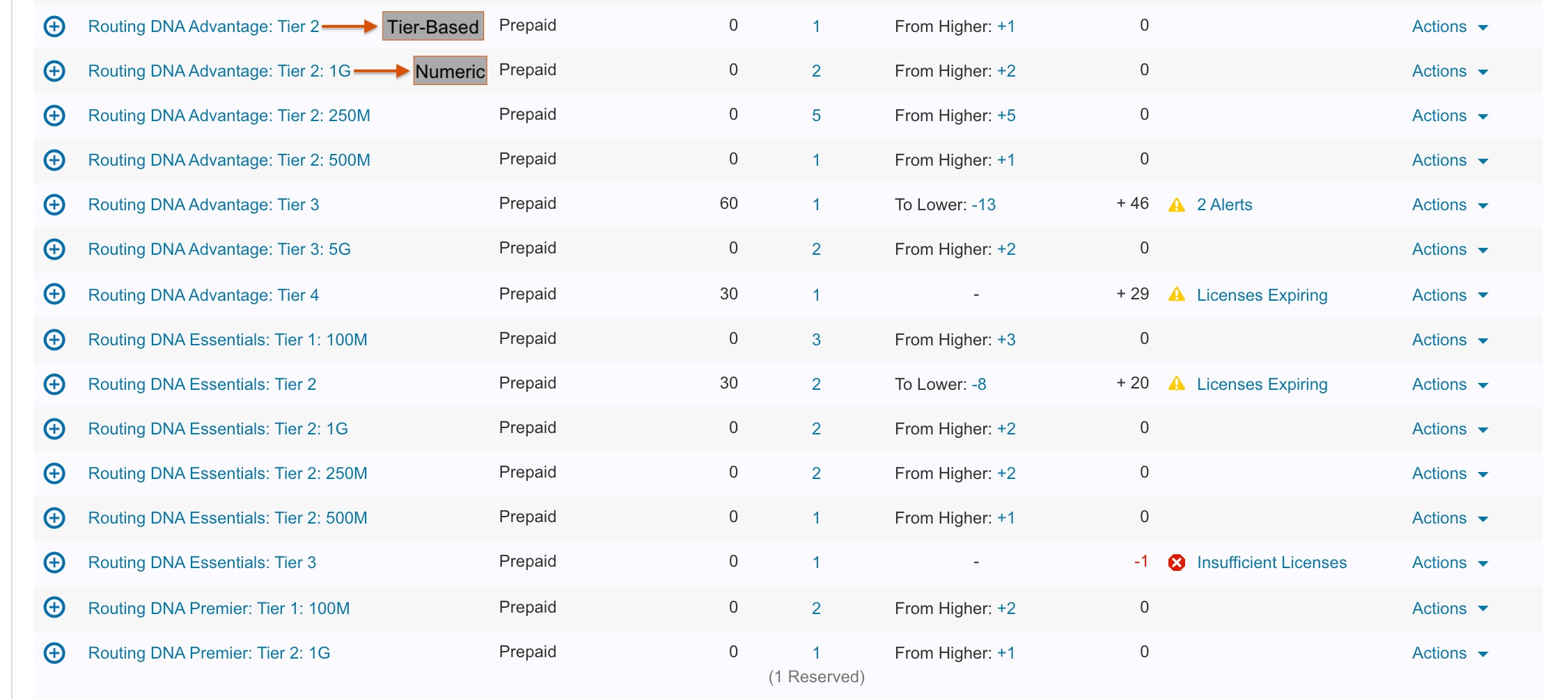既存の帯域幅ベースの(数値)スループットの設定に加えて、階層ベースのスループット設定のサポートが導入されました。 最も低いスループットレベルから始めて、使用可能な階層は階層 0(T0)、階層 1(T1)、階層 2(T2)、階層 3(T3)です。それぞれの階層はスループットレベルを表します。 製品のライセンス PID が階層ベースの場合、ライセンスは CSSM Web UI の階層値とともに表示されます。 階層ベースのライセンスを持つ製品の場合、階層ベースのスループット値を設定でき、階層ベースのスループット値に変換することもできます。 スループットおよび数値および階層ベースのスループットを参照してください。 |