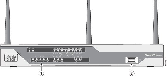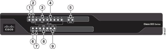 図 1-8 に、Cisco 819HGW ISR の前面パネルの詳細を示します。