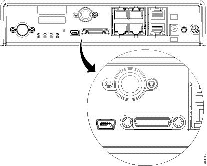 Cisco 892FSP は +12V 電源入力を 1 つ備えています。Cisco 892FSP の電源コネクタは、他の 890 シリーズ モデルのバレル型コネクタとは異なります。AC アダプタ ケーブル コネクタは 4 本のピンで構成され、ロッキング メカニズムが内蔵されています。図 3-33 に、電源アダプタ コネクタを示します。