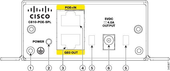 Cisco PoE+ スプリッタ(C810-POE-SPL)は PoE+ を電源と GE に分割します。入力と出力の両方で電源に組み込まれたコネクタが付いているため、オプションで好きな長さのケーブルを使用できます。図 1-4 に、PoE+ スプリッタの I/O 側を示します。