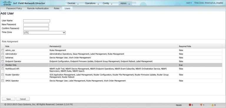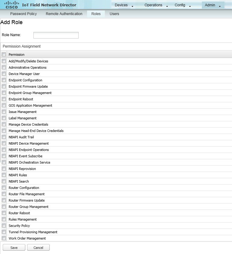 IoT FND では、カスタム ロールを定義できます。ユーザが作成する各ロールに、1 つ以上の基本ユーザ権限を割り当てることができます(IoT FND のユーザ権限 参照)。これらの権限はこのロールのユーザが実行できるアクションのタイプを指定します。