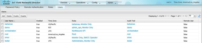IoT FND はそれ自体のユーザ アカウント データベースを管理しており、そのため、すべての新しいローカル ユーザを IoT FND のユーザ インターフェイスから追加する必要があります([Admin] > [Access Management] > [Users] ページ)。リモート ユーザはデータベースに自動的に追加されます。また、このページでユーザを有効化、無効化、編集、削除できます。