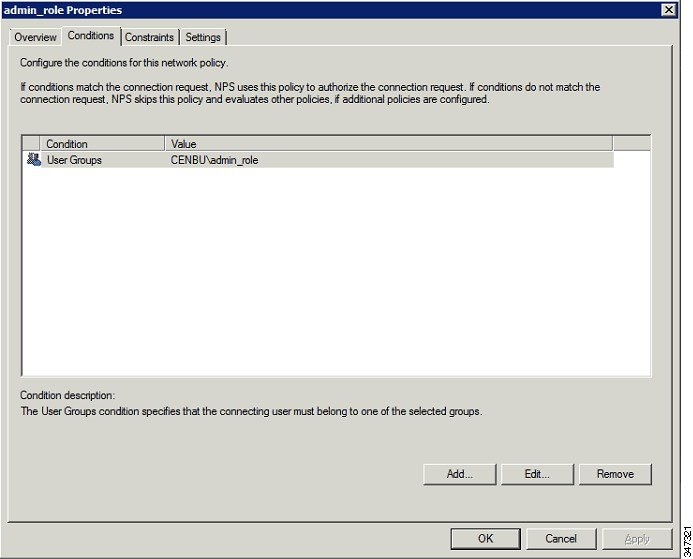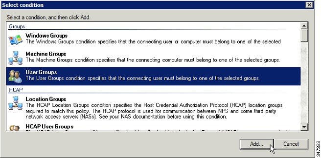 [Conditions] タブをクリックして、[User Groups] を選択し、[Add] をクリックします。