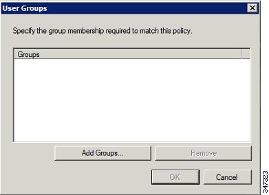 [User Groups] の条件は、接続するユーザが選択したグループに属する必要があることを指定します。このポリシーが条件を満たすには、認証されているユーザがこのポリシーで設定されるユーザ グループに属している必要があります。