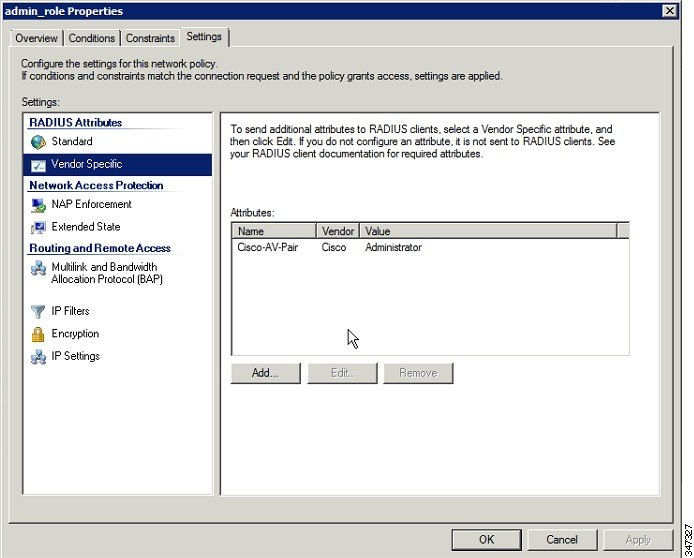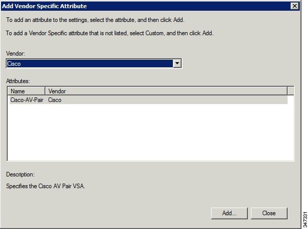 [Add] をクリックして、ユーザ クレデンシャルとセキュリティ グループのメンバーシップが確認された後に IoT FND(RADIUS クライアント)に送信される [Vendor Specific Attribute](VSA)を定義します。