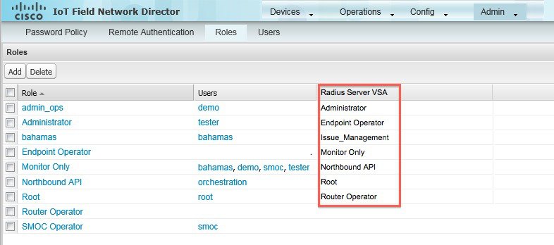 (注)[Attribute value] フィールドに入力されるストリングは、IoT FND の [Roles] ページの [Radius Server VSA] 列に表示される正確な文字列である必要があります([Admin]