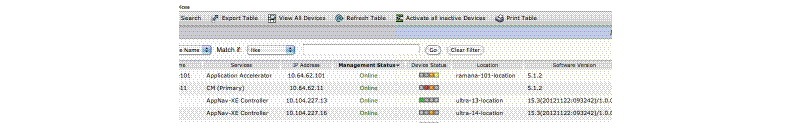 AppNav コントローラが WCM に正常に登録されると、WCM GUI のデバイス リストの下に AppNav-XE コントローラが「AppNav-XE Controller」として表示されます。[Devices] > [Device List] に移動します。次の図を参照してください。
