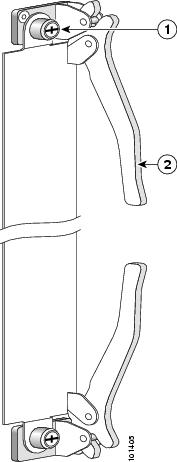 ライン カード シャーシ内の他のカードや PLIM はイジェクト レバーと非脱落型ネジでシャーシに取り付けれられています。ミッドプレーン コネクタからカードや PLIM を取り外すには、2 つのイジェクト レバーを使用します。イジェクト レバーと非脱落型ネジの正確な位置はカードの種類によって若干の違いがありますが、大概は同じ位置、つまりカードの前面プレートの上端と下端にあります。次の図に、イジェクト レバーと非脱落型ネジの位置を示します(図は MSC の場合)。