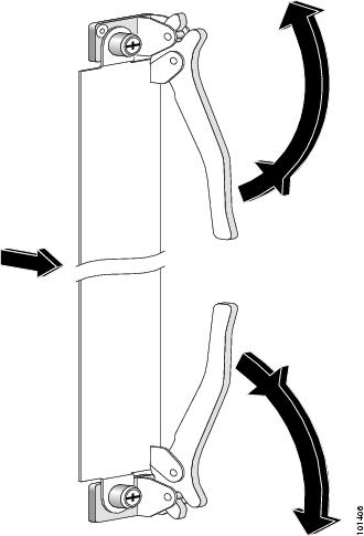 カードをバックプレーン コネクタに固定するため、カード イジェクト レバーを両方持ってカード キャリアのハンドル方向へ内側に回し、イジェクト レバーがカード キャリアの前面と同一平面になるようにします。