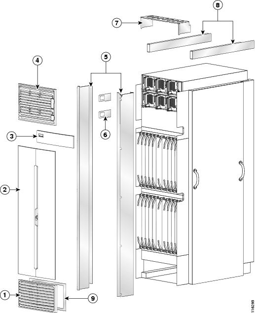 ライン カード シャーシには、シャーシ前面(PLIM 側)用の外装コンポーネントのセットが付属します(次の図を参照)。