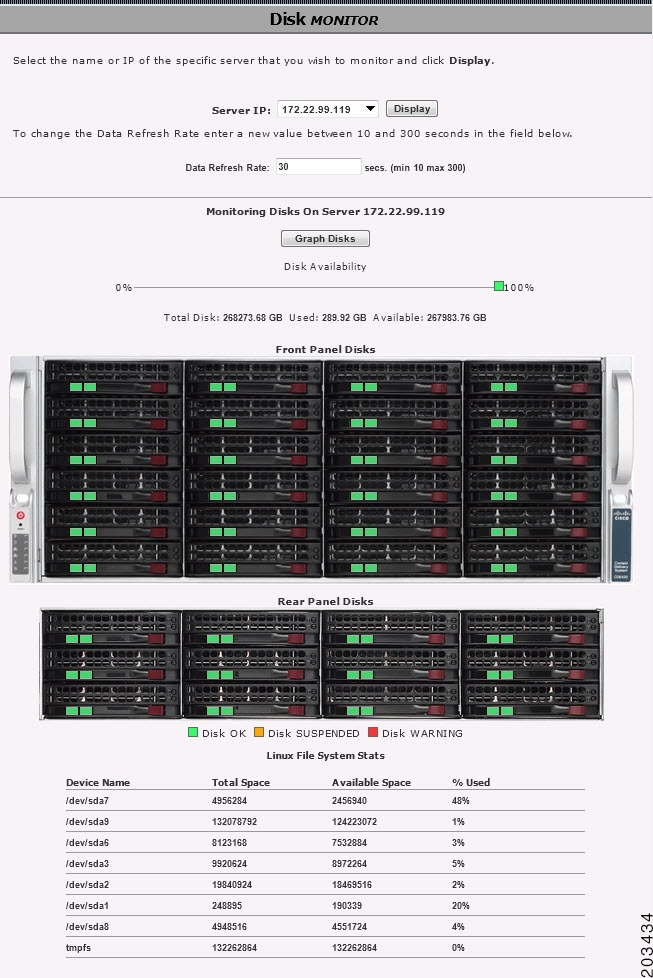 ディスクの現在のステータスを表示するには、[Disk] ページのドロップダウン リストからサーバの IP アドレスを選択し、[Display] をクリックして、グラフィックに表示されるディスクのいずれか 1 つのディスク上にマウスを動かします。サーバが Lindenhurst CDE の場合は、グラフィックに表示されているディスクの 1 つをクリックします。図 4-13 に、Streamer サーバの例を示します。