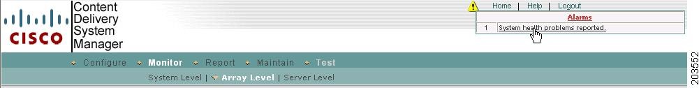 [System Health] ページは、CDS の各グループおよび各グループの各サーバの健全性の最上位のビューを表示します。アラーム イベントが発生している場合は、CDSM バナーにアラームが表示されます。[Alarms] メニューは、アラームのアイコンにマウスを合わせると表示されます。図 4-1 を参照してください。[Alarm] メニューのアラーム イベントをクリックすると、詳細が表示された [CDSM] ページに移動します。たとえば、図 4-1 では、[System health problems reported] をクリックすると、[System Health] ページに移動します。