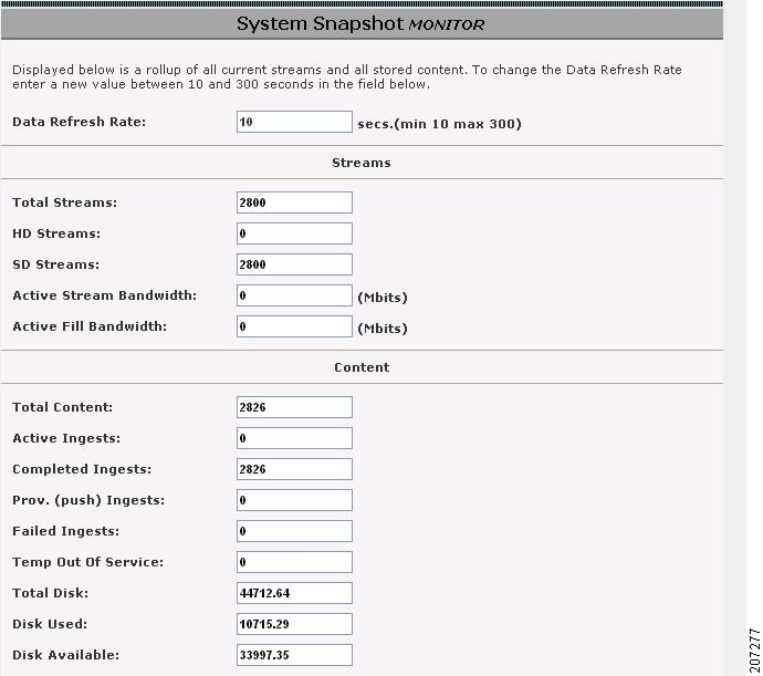 [System Snapshot] ページには CDS の現在のアクティビティの概要が表示されます。すべてのストリームの状態、コンテンツの取り込み、およびディスク使用率のサマリーが表示されます。図 4-3 を参照してください。