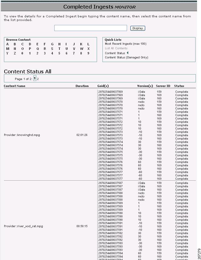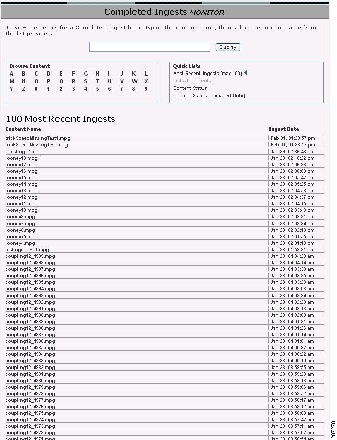 [List All Contents]:すべての完了した取り込みをコンテンツ名でソートしてリストします。このオプションは、完了した取り込み数が 100 未満の場合にだけ使用できます。