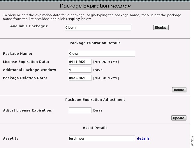 パッケージを削除するには、[Available Packages] ドロップ ダウン リストからパッケージを選択し、[Display] をクリックしてから、[Package Expiration Details] セクションで [Delete] をクリックします。