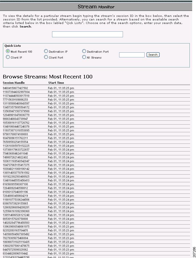 [Destination IP]、[Destination Port]、[Client IP]、[Client Port]:セッション ハンドルが不明な場合は、検索するフィールドを選択して [Search String] フィールドに文字列を入力し、[Search] をクリックすることで文字列の検索を行うことができます。選択したフィールドにその文字列が含まれるストリーム オブジェクトのリストが表示されます。リンクされているフィールド(図 4-9 に示されているようなセッション ハンドル)をクリックして選択したオブジェクトのストリーム モニタ詳細を表示するか、または [Back] をクリックして前ページに戻ります。