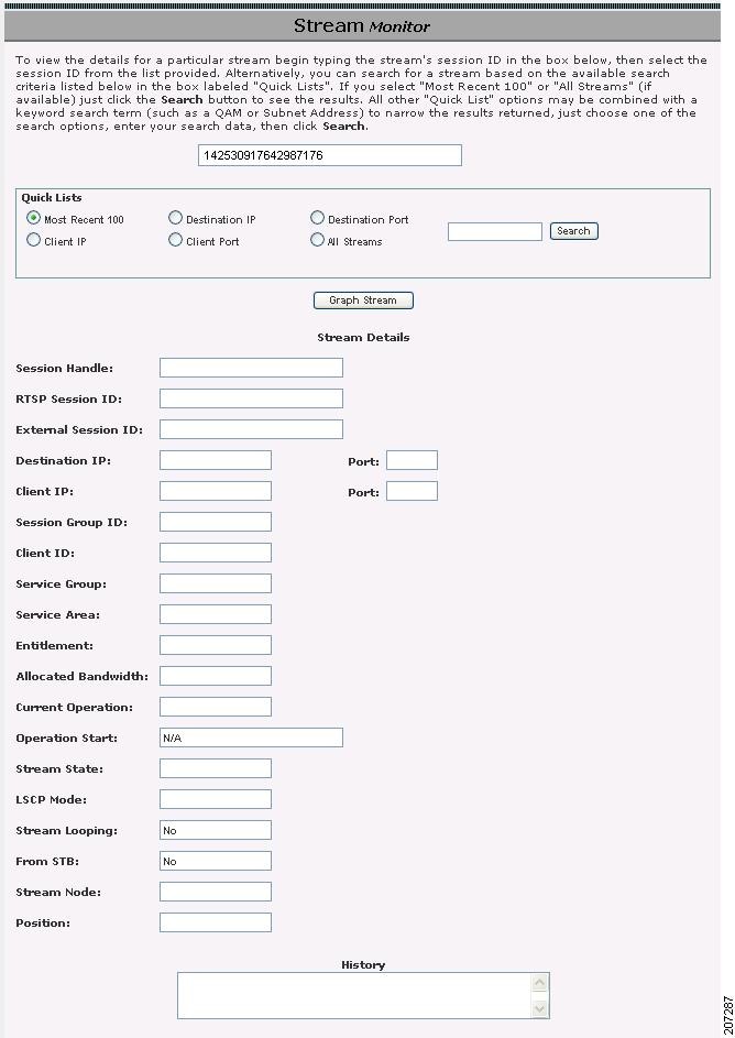 テキスト ボックスにセッション ハンドルの最初の文字を入力します。ストリーム オブジェクトのドロップ ダウン リストが表示されます。入力した最初の文字で始まるオブジェクトが 25 個よりも多い場合、オブジェクト名の次の文字を続けて入力するか、リストされている 1 を選択するように要求されます。続けて文字を入力してリストを絞りこみ(文字を削除してリストを増やすこともできます)、任意の時点でいずれか 1 つをクリックすることもできます。1 を選択すると、ストリームの詳細が表示されます(図 4-10)。