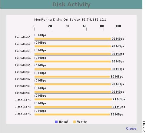 選択したディスクで直近の 5 秒間に発生した現在の読み取り/書き込みアクティビティを表示するには、[Graph Disks] をクリックします。図 4-14 に、[Disk Activity] グラフの例を示します。
