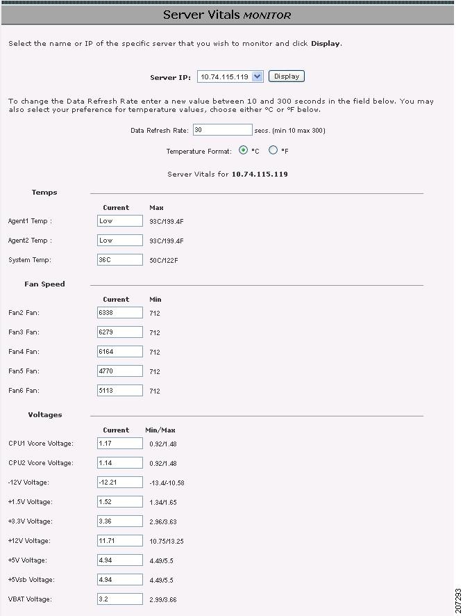 モニタ対象コンポーネントの現在の値、しきい値設定を表示するには、[Server Vitals] ページのドロップダウン リストからサーバの IP アドレスを選択し、[Display] をクリックします。