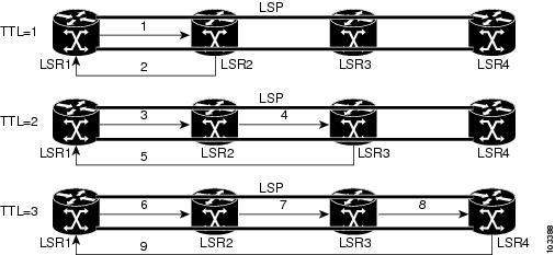 MPLS LSP traceroute 機能を使用して、LSP の障害ポイントを隔離します。これはホップバイホップ エラーのローカリゼーションとパス トレースに使用されます。MPLS LSP traceroute 機能は、エコー要求を伝送するパケットの存続可能時間(TTL)値の期限切れに依存します。MPLS エコー要求メッセージが中継ノードを見つけると TTL 値をチェックし、期限が切れている場合はコントロール プレーンにパケットが渡されます。それ以外の場合は、メッセージが転送されます。エコー メッセージがコントロール プレーンに渡されると、要求メッセージの内容に基づいて応答メッセージが生成されます。