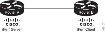 iPerf サーバはルータ A に、iPerf クライアントはルータ B にインストールされています。どちらのインストールも IOS RX でネイティブに実行されます。iPerf クライアントは、IOS XR が提供するインターフェイスを通じて iPerf サーバと通信します。