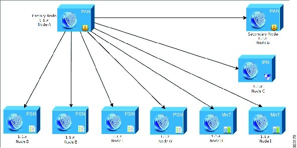 Cisco ISE、リリース 1.2 へのアップグレード時には、最初にセカンダリ管理ノードをリリース 1.2 にアップグレードします。 たとえば、図 2 に示すように、1 つのプライマリ管理ノード(ノード A)、1 つのセカンダリ管理ノード(ノード B)、1 つのインライン ポスチャ ノード(IPN)(ノード C)、および 4 つのポリシー サービス ノード(PSN)(ノード D、ノード E、ノード F、およびノード G)、1 つのプライマリ モニタリング ノード(ノード H)、および 1 つのセカンダリ モニタリング ノード(ノード I)を含む展開がセットアップされている場合、次のアップグレード手順に進むことができます。