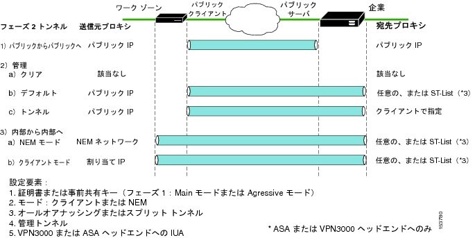 図 8-1 に、ユーザが入力したコマンドの組み合わせに基づいて Easy VPN クライアントが起動するトンネルのタイプを示します。